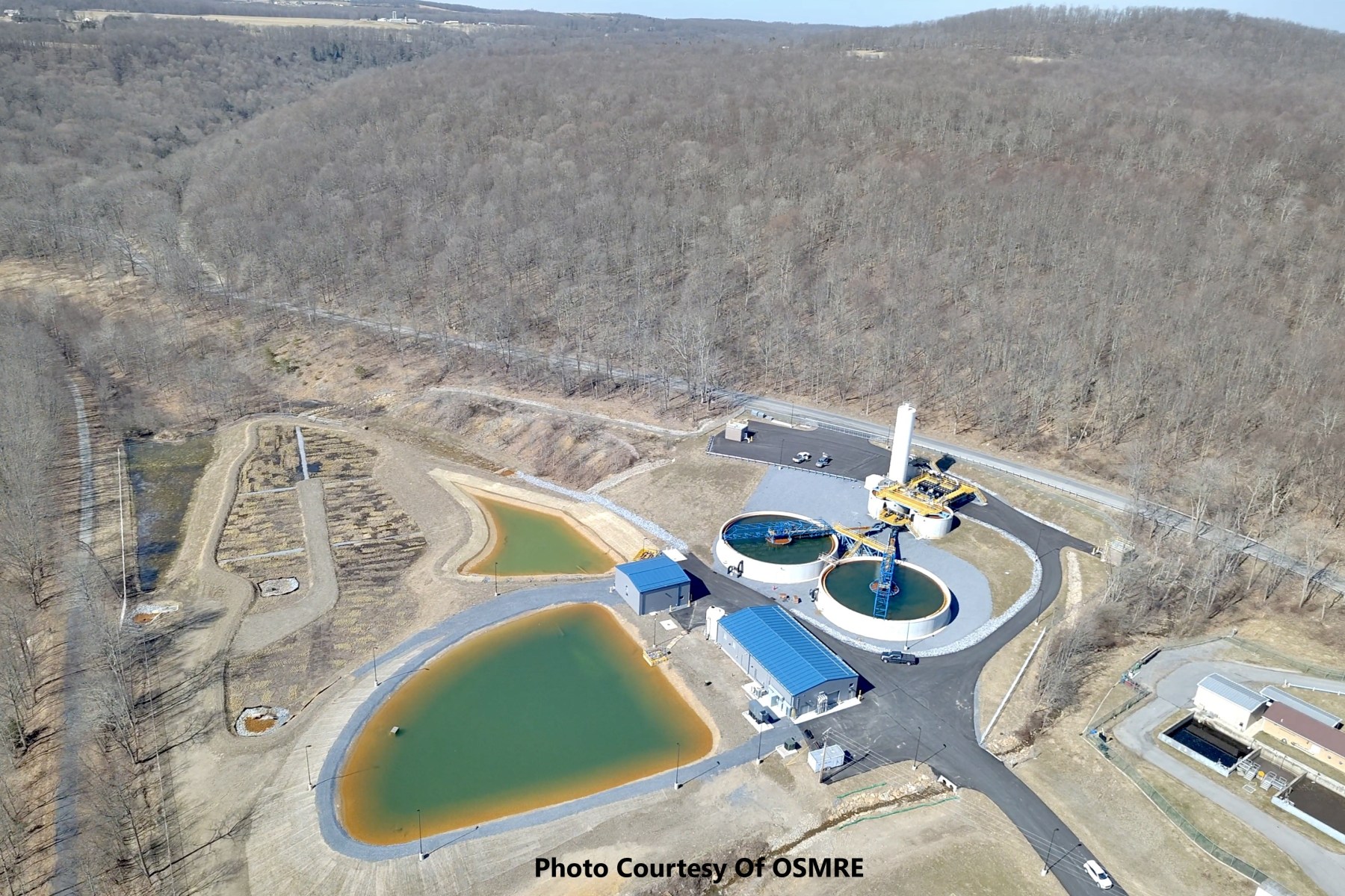 Users of the Ghost Town Trail pass by the plant located approximately one-half mile west (downstream) of Vintondale. The highly complex project included purchase of approximately 35 acres of land, construction of miles of pipelines, development of extraction wells, mine drainage injection wells, and sludge injection wells in addition to plant construction. Tetra Tech Inc., was awarded the design contract and the plant was constructed by HRI, Inc. Funding for project construction was provided by the Pennsylvania State Legislature, the federal AMD set aside program, and the federal Abandoned Mine Land Economic Revitalization Program (AMLER). The projected $600,000 per year operating cost will be funded with Infrastructure Investment and Jobs Act funds.