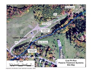 BCWA constructed two passive treatment systems adjacent to the headwaters of Coal Pit Run, a tributary to the South Branch Blacklick Creek. The systems are located north of Expedite Road, to the east of the village of Twin Rocks, in Blacklick Township, Cambria County. Both systems were built in 2005. The Lower Treatment System has been negatively impacted by some construction activities, which disrupted the flow into the system. However, the Upper Treatment System continues to effectively treat water and enhances the water quality of the headwaters area of Coal Pit Run. The Upper Treatment System consists of a collection pond, a vertical flow pond (containing crushed limestone and organic material) and a settling pond. The Lower System was funded by the federal Office of Surface Mining (OSM) Watershed Cooperative Assistance Program. The Upper System was funded through an EPA Section 319 grant. Reports, maps, photos, and water sampling results for the upper system have been posted on the Datashed website at https://www.datashed.org/project-coal-pit-run-upper-system. Similar information and data on the upper system may be found at https://www.datashed.org/project-coal-pit-run-upper-system.