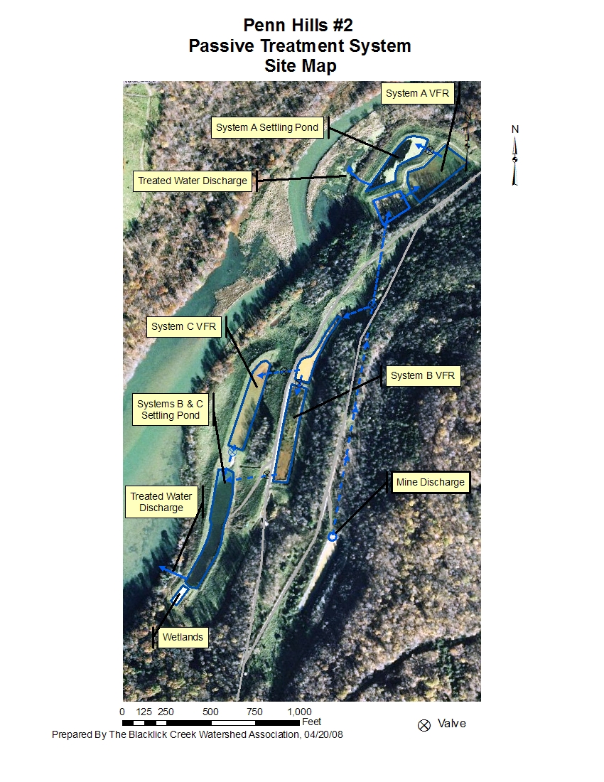 The Penn Hills #2 passive treatment system treats one of three large discharges that are tributary to the Two Lick Reservoir, located about in the middle of the Two Lick Creek subwatershed of Blacklick Creek. The owners of the Homer City Power Plant originally constructed the reservoir to ensure a reliable source of water for use at the plant. In addition to the Penn Hills #2 discharge, the Dixon Run Mine (treated by an active treatment plant) and the Penn Hills #1 Mine (currently not being treated) discharge into the reservoir. The Penn Hills #2 Mine discharge is one of the largest discharges in the Two Lick watershed. The Penn Hills #2 system was constructed through a partnership between BCWA and the Pennsylvania DEP using a combination of bond forfeiture monies and grants.
